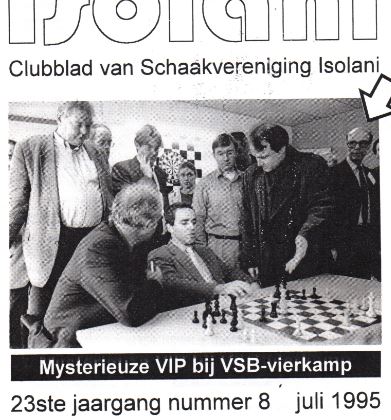 Dat op de pagina hierboven Kasparov achter het bord zit, en dat op de voorpagina van een clubblad, is al wel verrassend. Maar wie is de – naar het schijnt – geheim agent, daar rechts achter, achter die grote bril? Dat is Wim Elsenaar!!!